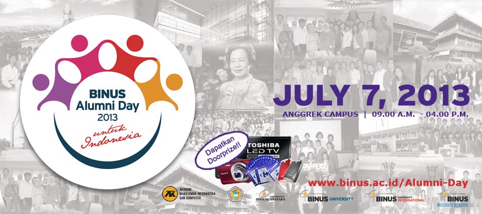 BINA NUSANTARA PROUDLY PRESENT: BINUS ALUMNI DAY 2013 DATE: Sunday, July 07, 2013 Time: 09.00 am – 04.00 pm Place: BINUS Anggrek