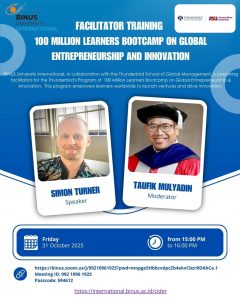 As part of this collaboration, BINUS University held facilitator training for the 100 Million Learners Bootcamp on Global Entrepreneurship and Innovation on Friday, 31 October 2025. The event featured Simon Turner, from the Thunderbird School of Global Management, as the speaker, and Taufik Mulyadin, a faculty member of BINUS University International, as the moderator. The training session was conducted online and brought together facilitators and lecturers who will play a key role in guiding students through the upcoming bootcamp sessions.