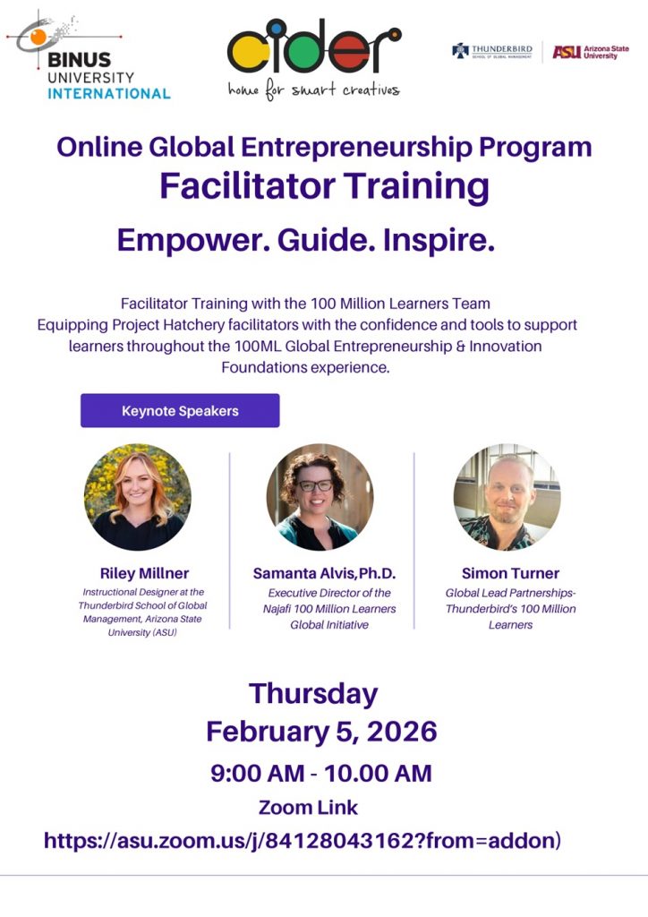 Building on the successful Facilitator Training for the 100 Million Learners Bootcamp on Global Entrepreneurship and Innovation previously conducted in collaboration with the Thunderbird School of Global Management at Arizona State University, BINUS University International continues its strong commitment to strengthening the capacity of Project Hatchery facilitators.