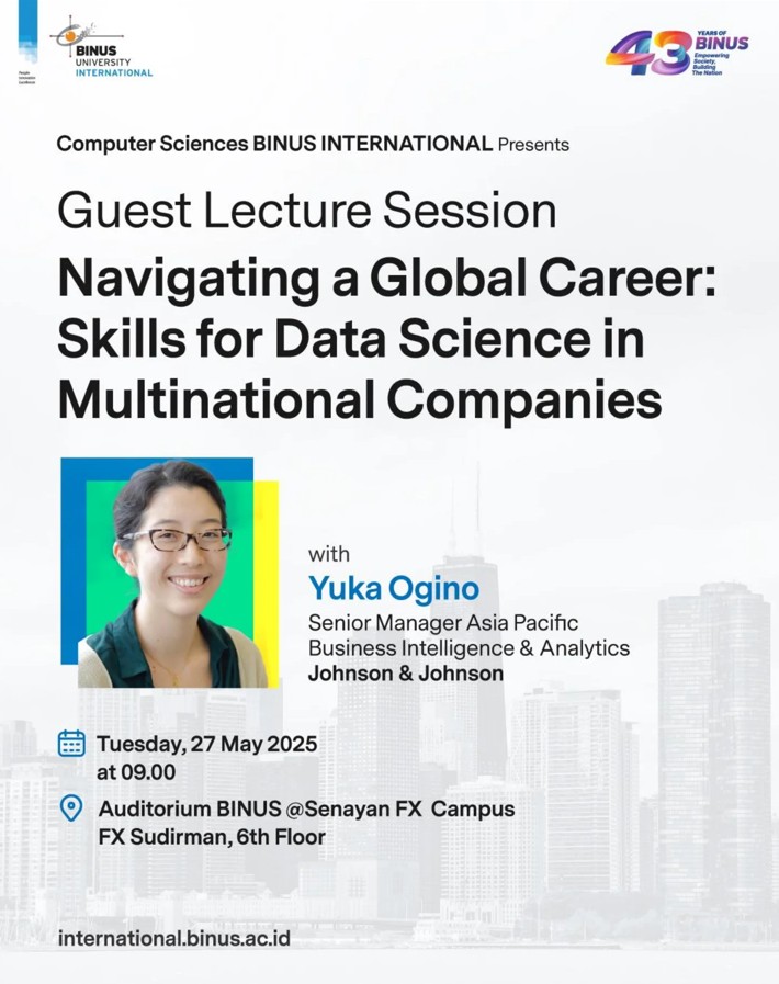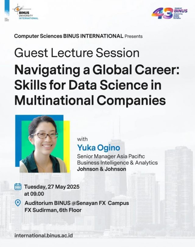 On Tuesday, May 27, 2025, BINUS University International hosted an engaging and insightful guest lecture titled “Navigating a Global Career: Skills for Data Science in Multinational Companies.” Held at the Auditorium BINUS @Senayan FX Campus (6th Floor, FX Sudirman), the session was graced by Yuka Ogino, Senior Manager Asia Pacific for Business Intelligence & Analytics at Johnson & Johnson.