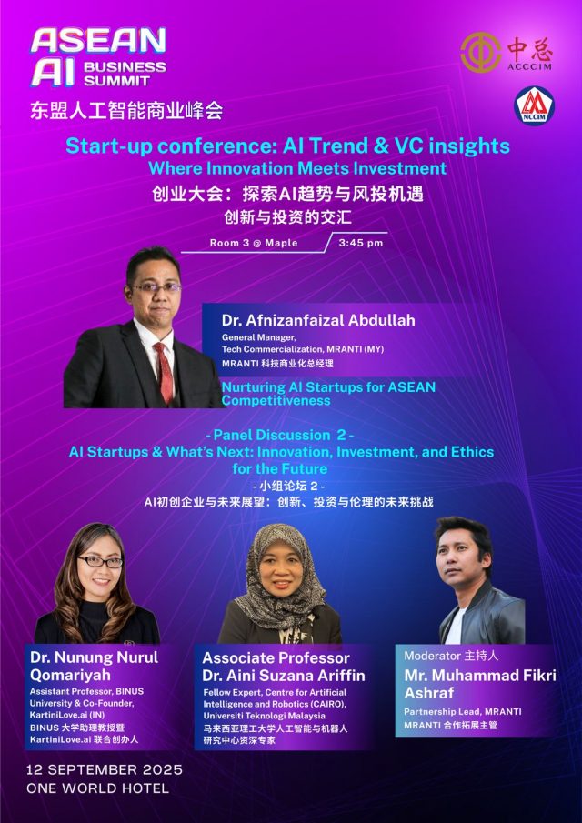 The session kicks off with a keynote by Dr. Afnizanfaizal Abdullah, General Manager of Tech Commercialization at MRANTI (Malaysia), who will speak on “Nurturing AI Startups for ASEAN Competitiveness.” His address will explore strategies to accelerate AI adoption and empower startups to scale across borders.