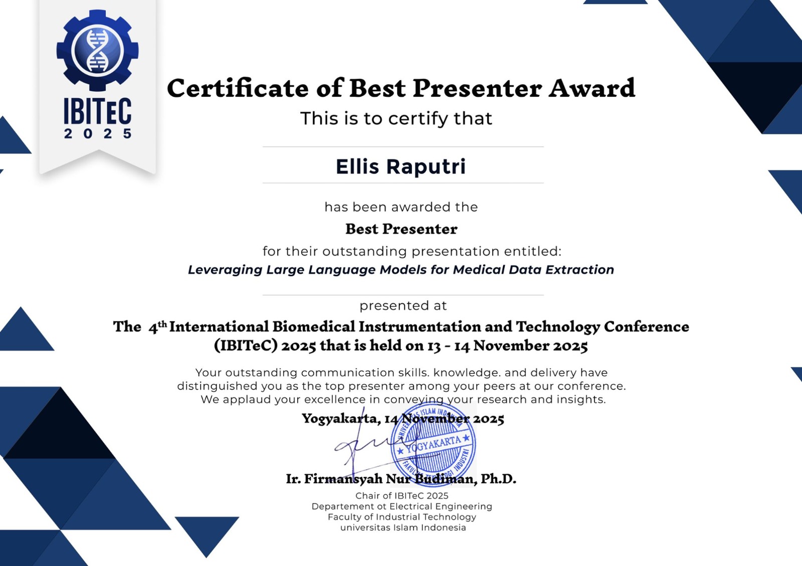 On November 13th, 2025, Ellis Raputri, a Computer Science student from Binus University International (Batch 2027), received the Best Presenter Award at the International Biomedical Instrumentation and Technology Conference (IBITec) 2025. The recognition was granted for her research paper titled “Leveraging Large Language Models for Medical Data Extraction”, presented at the 4th IBITech 2025.