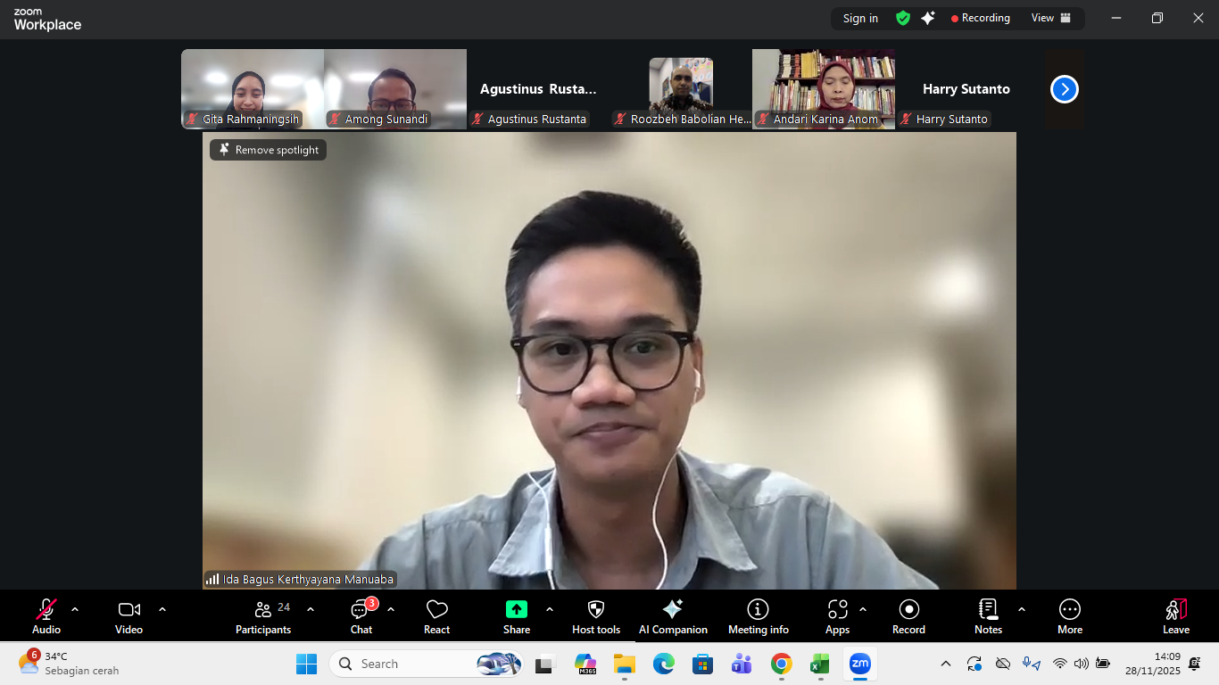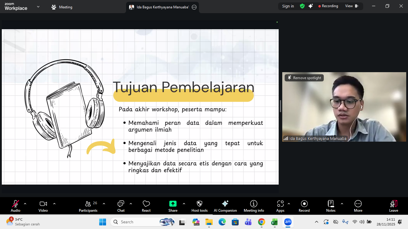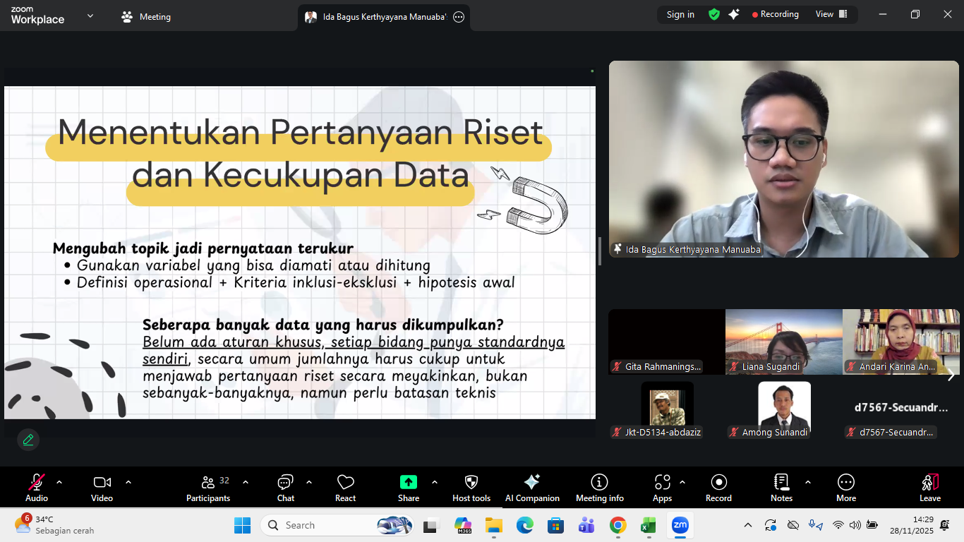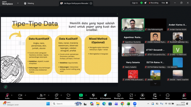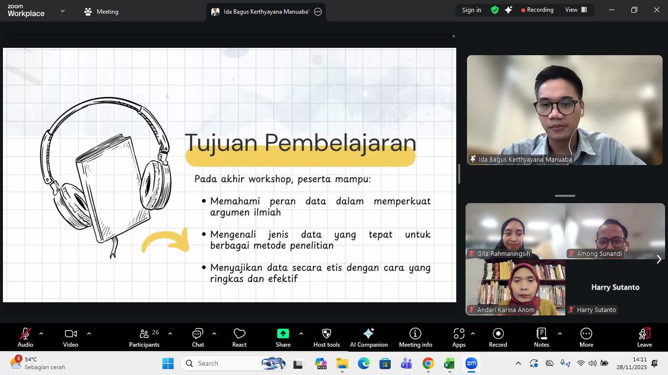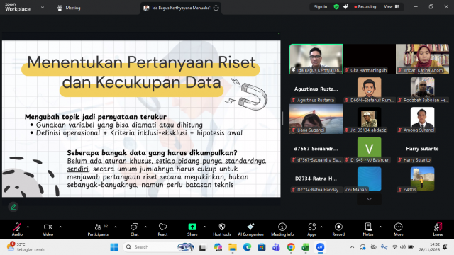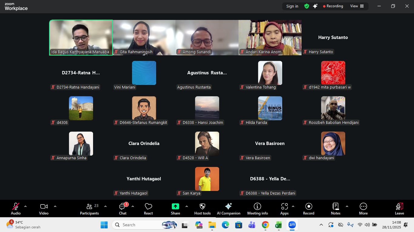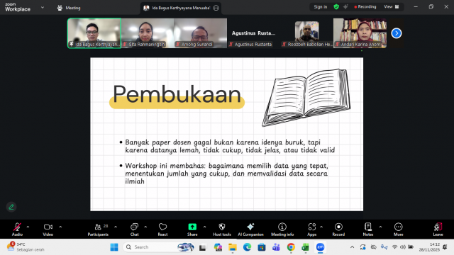 Binus University, through the School of Computing and Creative Arts, organized an intensive Pre-Workshop on Data Paper Writing aimed at strengthening the research and publication capabilities of its Faculty Members. The event took place on Friday, 28 November 2025, from 14.00 to 16.00 WIB, and was conducted online via Zoom to ensure broader accessibility for participants across departments.